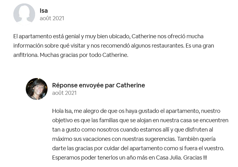 Buenos días María José, Gracias por tu comentario. Fue un placer contar con vosotros como inquilinos, me alegra muchísimo que disfrutaseis. Gracias por habernos elegido para el disfrute de sus vacaciones y por cuidar todo con tanto respeto. Esperamos poder tenerles un año más en Casa Julia. Catherine