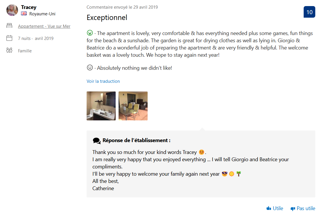 Propriétaire absolument charmante et vous accompagne très chaleureusement de la réservation à votre départ. L'accueil lors de votre arrivée est très soignée et agréable grâce au gérant Giorgio.
