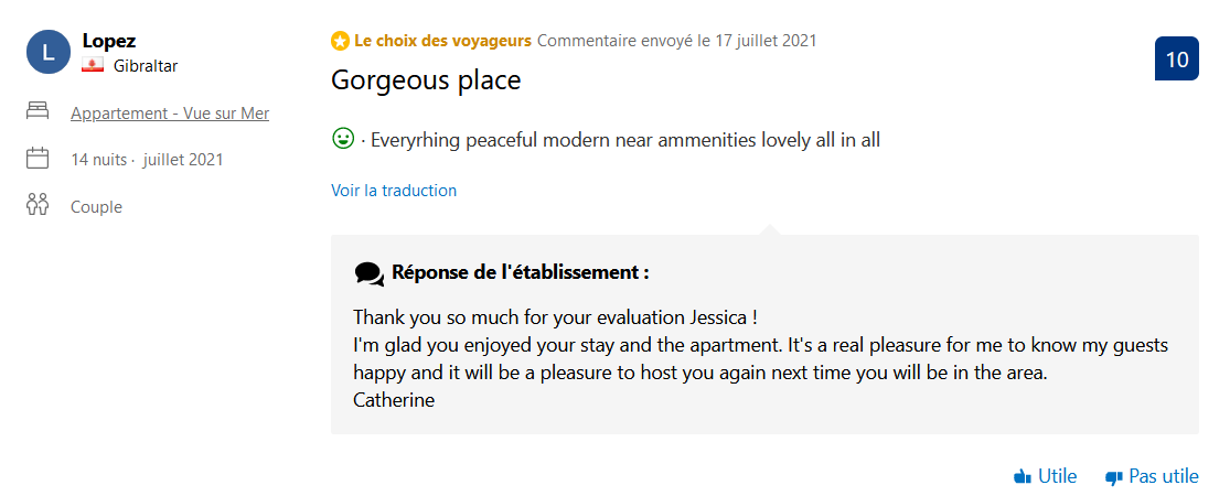Nous vous remercions infiniment pour votre appréciation et sommes très heureux que vous ayez passé un agréable séjour dans notre appartement. Nous serons ravis de vous accueillir à nouveau lors d'un prochain séjour dans notre belle Andalousie.